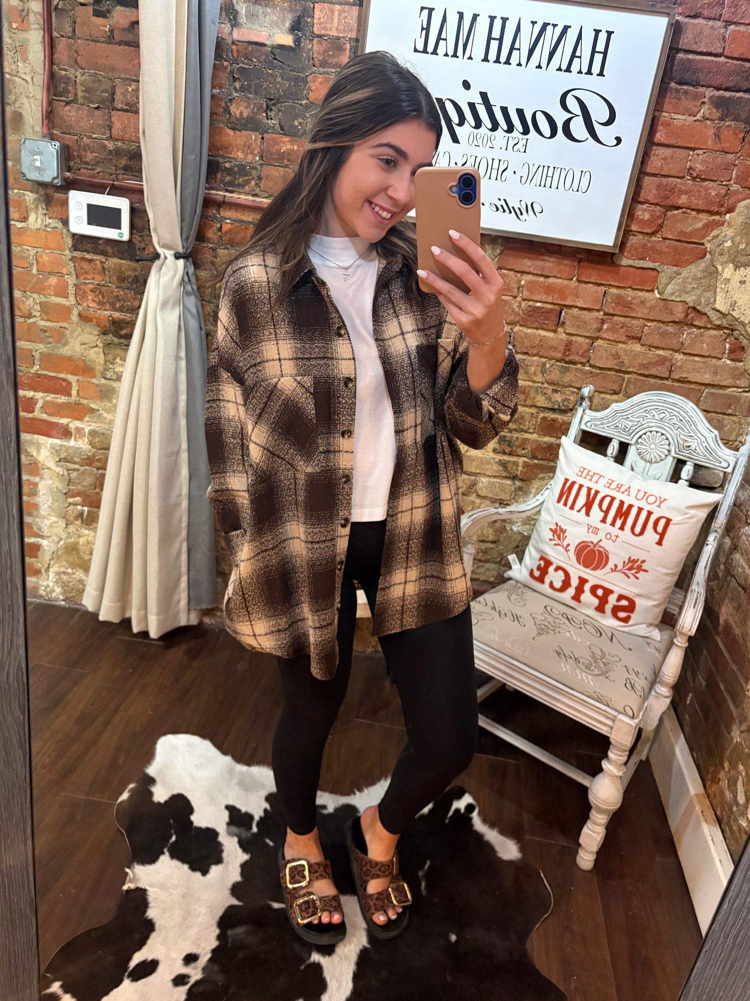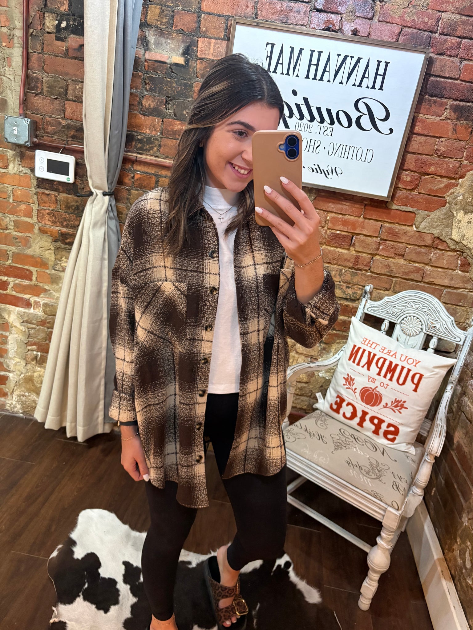 Layer up in cozy charm with the Fall Leaves Shacket. Featuring a brown and cream plaid pattern, this button-down combines warmth with casual style. Practical pockets add a handy touch, perfect for carrying little essentials on crisp autumn days. Soft and snug, it’s a sweet way to embrace the season’s colors.